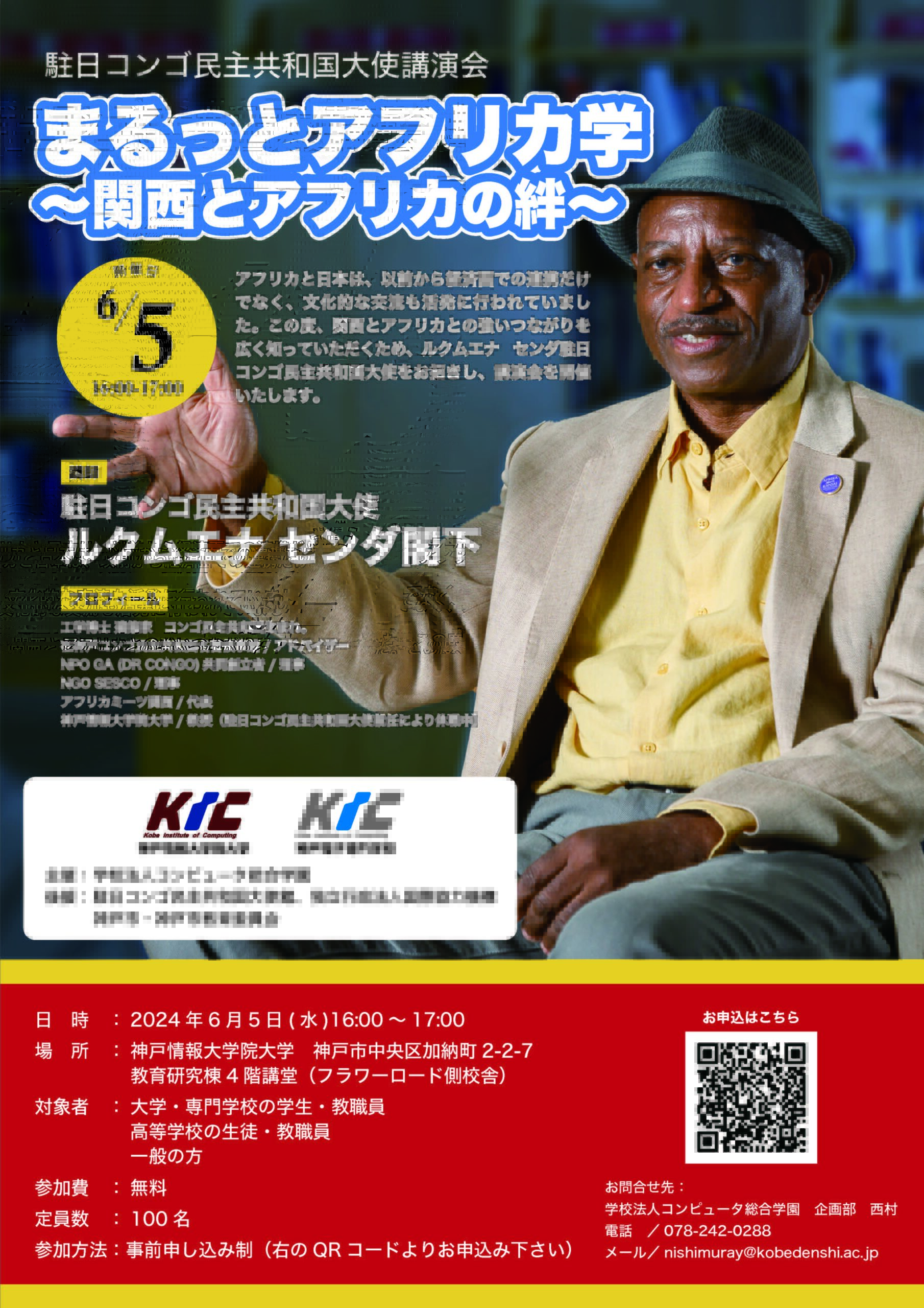 神戸情報大学院大学(KIC)ではこの度、関西とアフリカとの強いつながりを広く知っていただくため、KIC教授(現在大使就任により休職中)でもあるルクムエナ センダ駐日コンゴ民主共和国大使をお招きし、講演会を開催いたします。