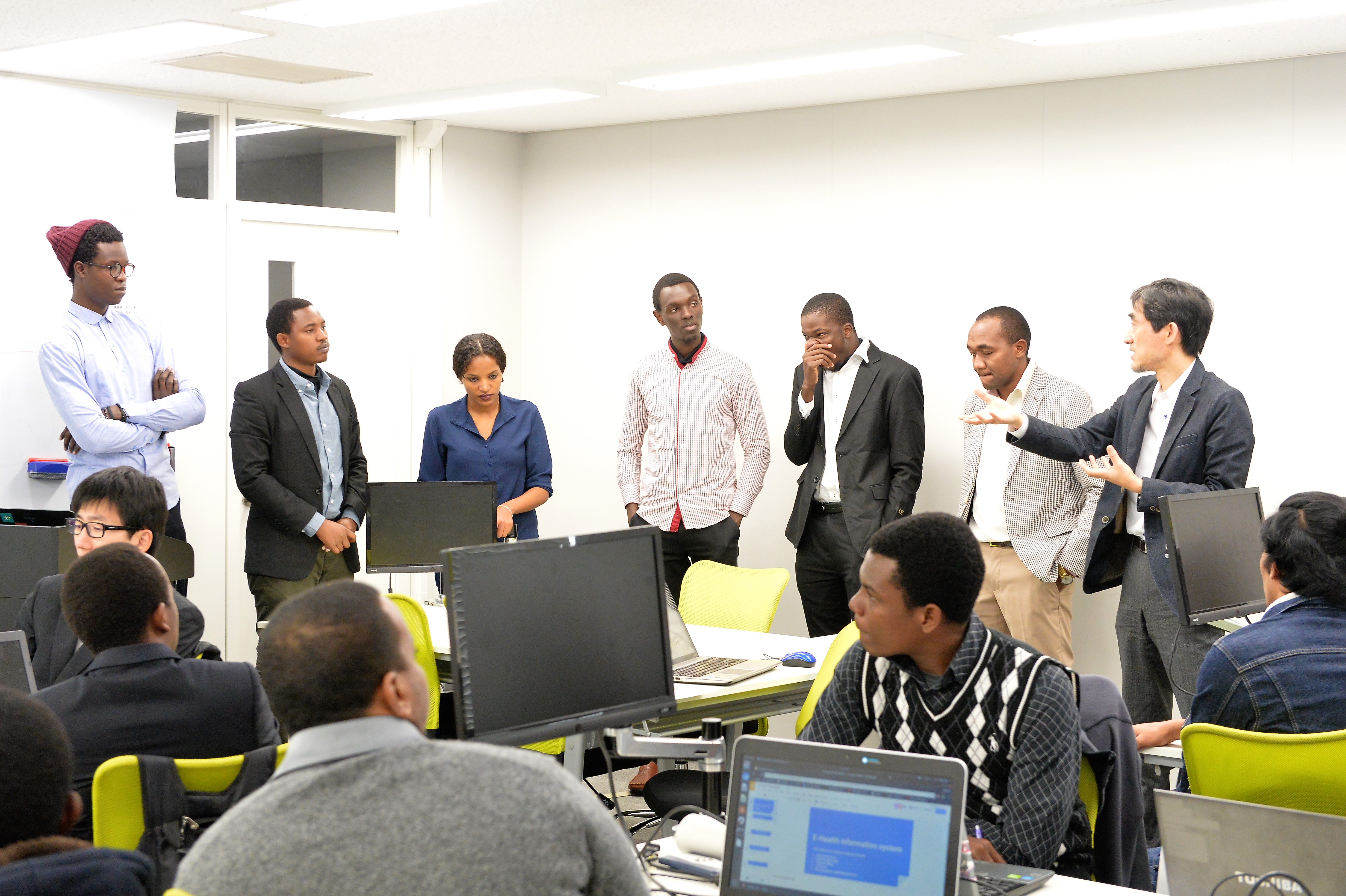 医療、農業、交通、教育など様々な自国の課題を背景に、ICTを活用した問題解決手法について各グループごとに発表が行われました。農業分野では、生産者が仲介者によって現実の市場の利用を制限されている社会的背景があるとし、生産者と顧客をICTの環境で構築したプラットフォーム上で一元管理を図り、生産者や顧客が効率的に生産物の販売や購入、お金の流れをモバイルで管理することが可能となるシステムの提案などもありました。本演習ではさらに、事業としての持続性も報告されるなど、社会実装に踏み込んだ議論が展開されました。
