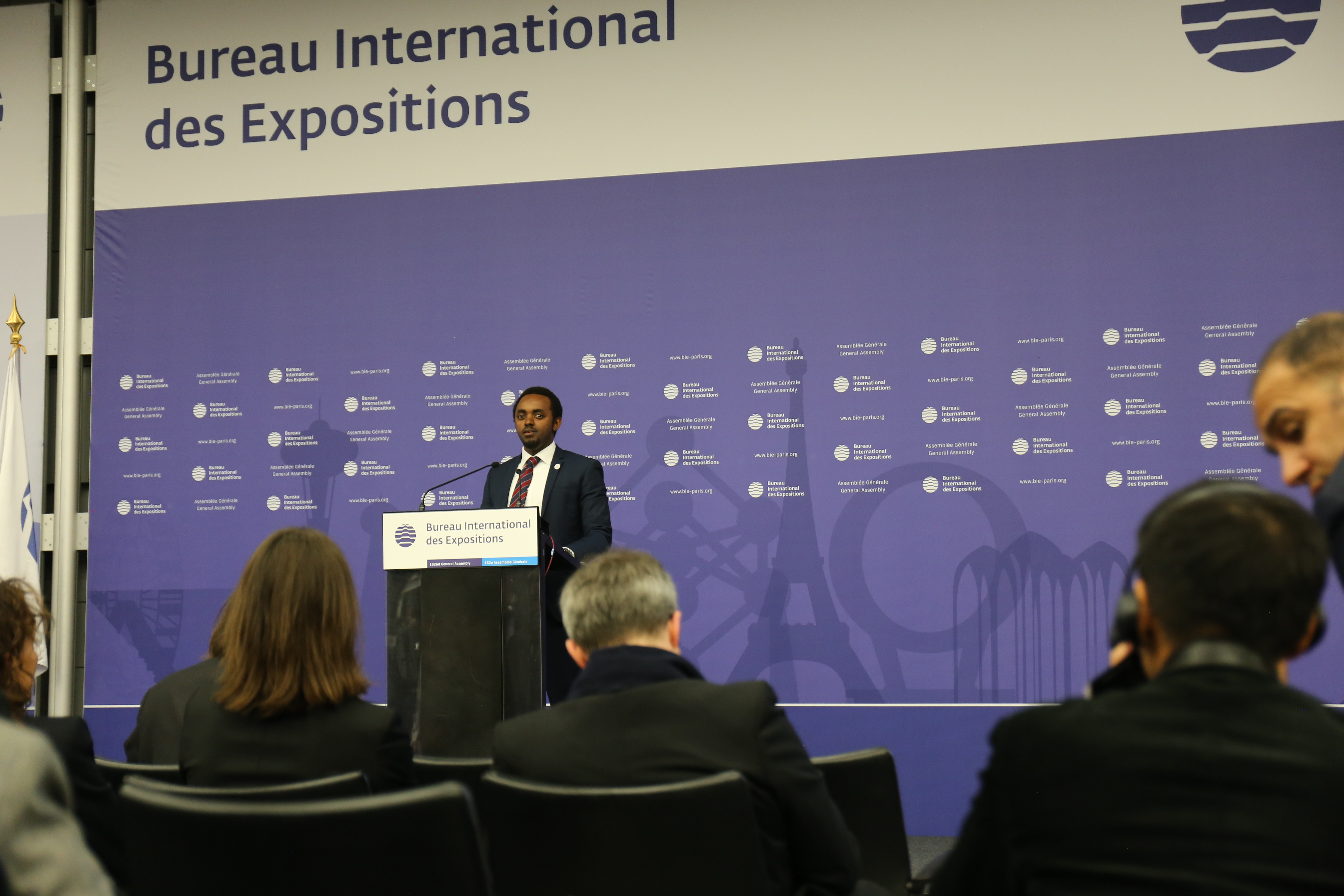 去る11月15日、フランス・パリで行われたBIE(博覧会国際事務局)総会にて、日本は2025年の国際博覧会を大阪・関西に誘致すべく、6月に行われた第1回プレゼンテーション(榊原定征経団連会長と松井一郎大阪府知事がスピーチ)に続く2回目のプレゼンテーションを行いました。既に、TVや新聞などで報道され、ご存知の方も多いと思うのですが、日本代表プレゼンターとして、吉村洋文大阪市長らとともに、この舞台でスピーチしたのが、本年9月に本学ICTイノベータコースを修了したばかりの、ジョアキム・ルタイシレさん(ルワンダ出身)です。ジョアキムさんは、アフリカ若年層の産業人材育成プログラム(ABEイニシアティブ)を通じて、本学に入学。在学中は、IoT(特に各種センサ等)を使って、ルワンダの重要作物であるコーヒーの生産の効率化、高品質化の研究に取り組まれていました。今回、日本が世界に向けてアピールしたい「世界の国々との協働」をプレゼンテーションする上で、留学を通じ日本、特に関西の良さをよく理解していることや、日本で技術を学び、国際目標であるSDGsに取り組む活動などが評価され、ジョアキムさんが大役に抜擢されたのではと、考えております。