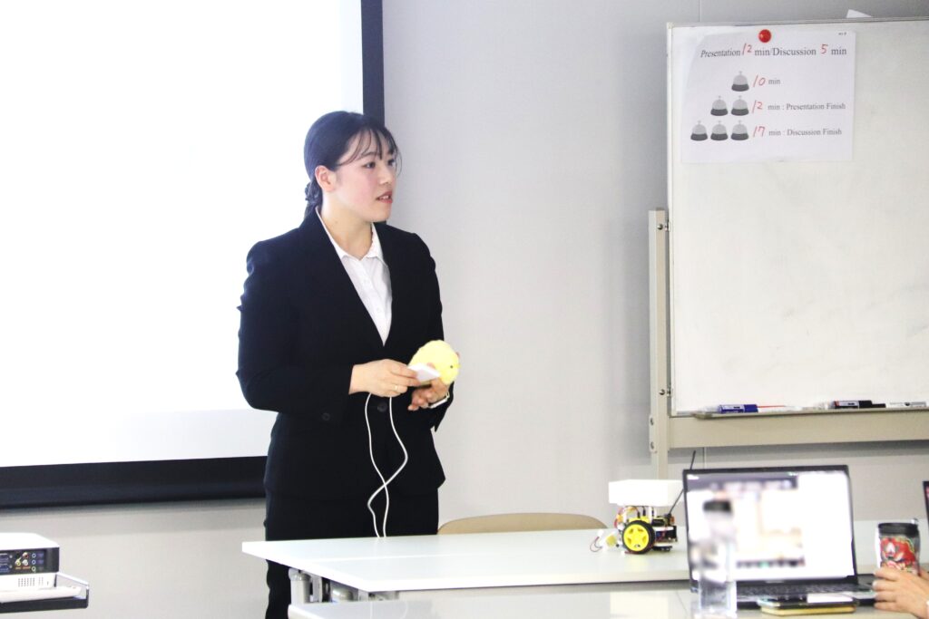 志摩真那早さんは、デスクワークの増加に伴い、疲労や眠気を感じながらも適切な休憩を取れない人が多いという課題に着目し、疲労・眠気検知とロボットによる休憩誘導を統合した支援システムを提案しました。